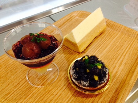 手前の2つは、左がぶどうのジュレ。右がブルーベリーのタルト。